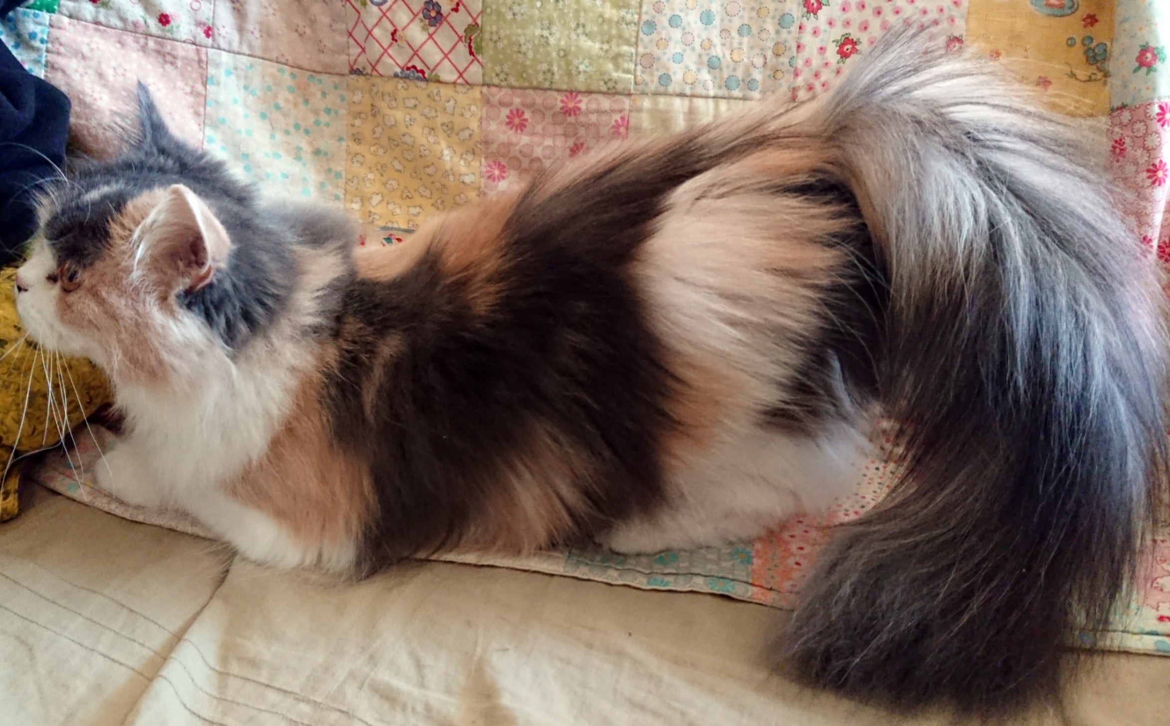 本日、12月2日(火)で投薬78日目になります。みーこは体重が3.1kgになりました。腹水が抜けて2kgまで減りましたが、その後順調に増え、触診で背骨のゴツゴツした感じも無くなりふっくらしています。避妊手術前にFIPを発症したため、現在、絶賛発情期中です。元気なのはとても嬉しいです。