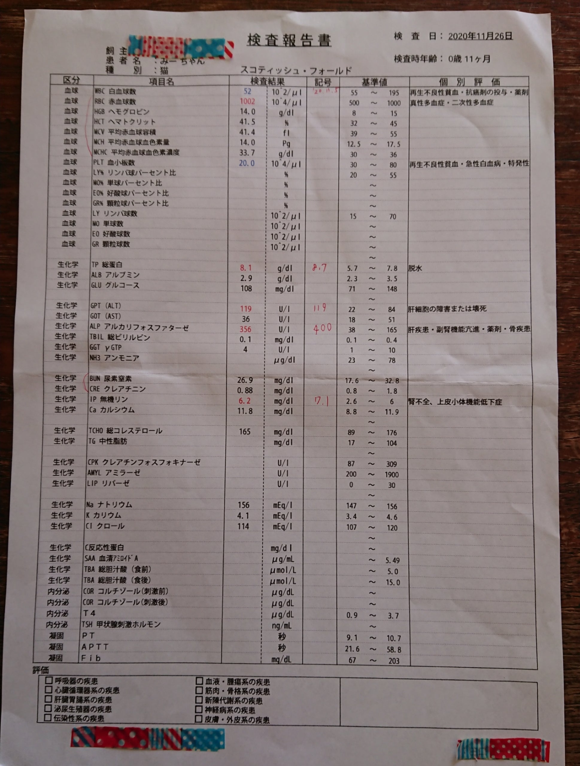 かかりつけ医での血液検査の結果をご報告させていただきます。11/5と11/26、2回分ございます。