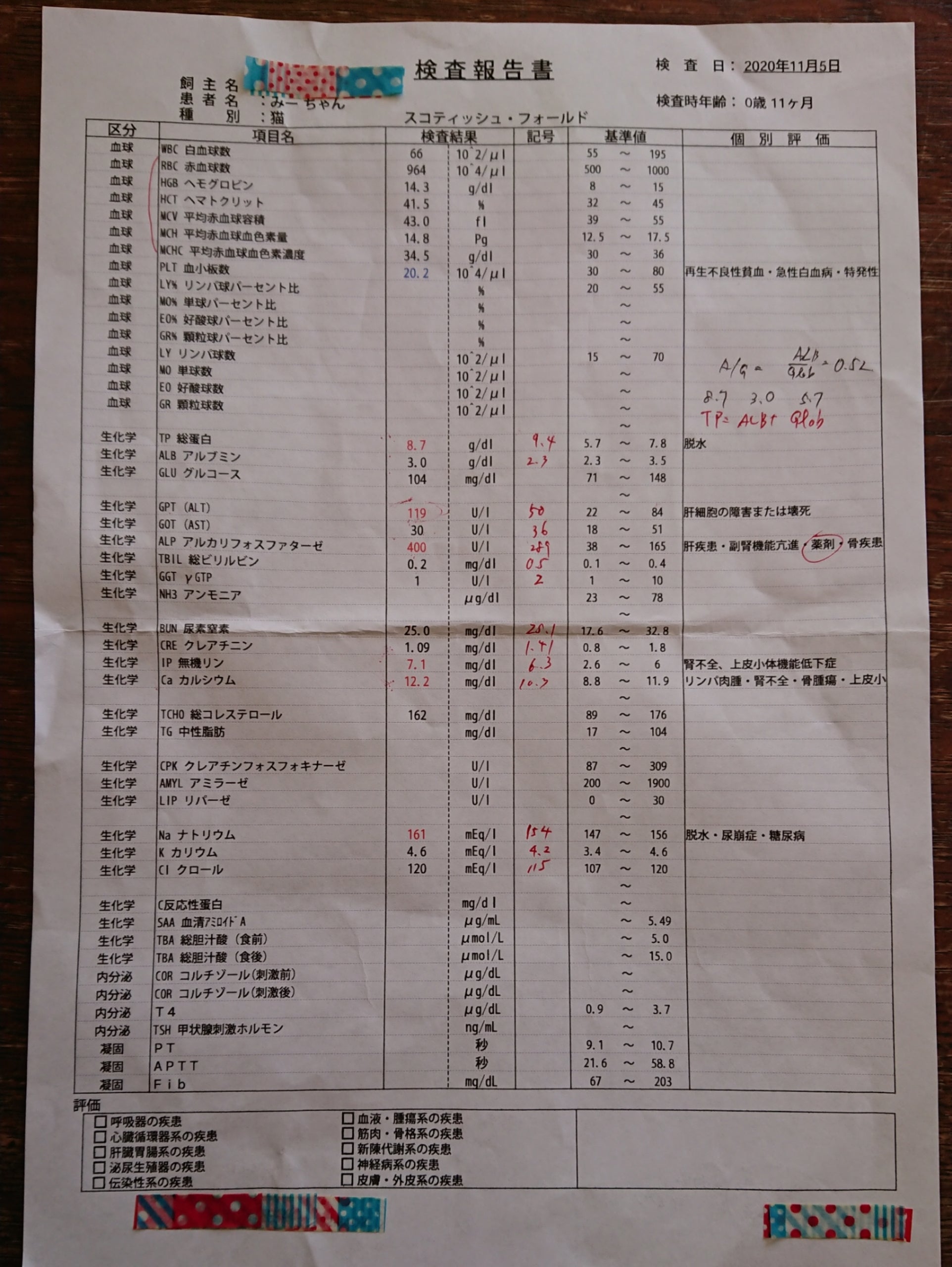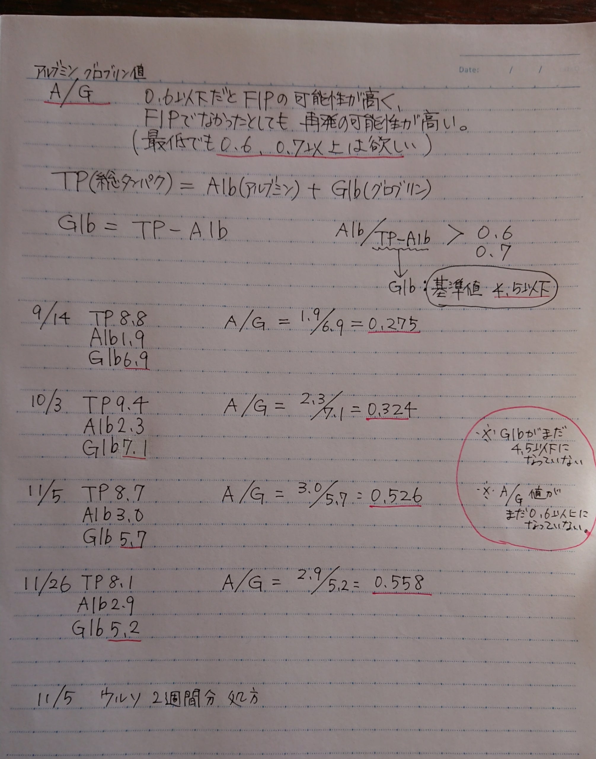 いわゆるA/G値ですが、「0.6以下だとFIPの可能性が高く、FIPでなかったとしても再発の可能性が高い」と言われている値ですが、0.275→0.324→0.526→0.558と徐々に良くなっていますが、まだ目標値まで未達です。