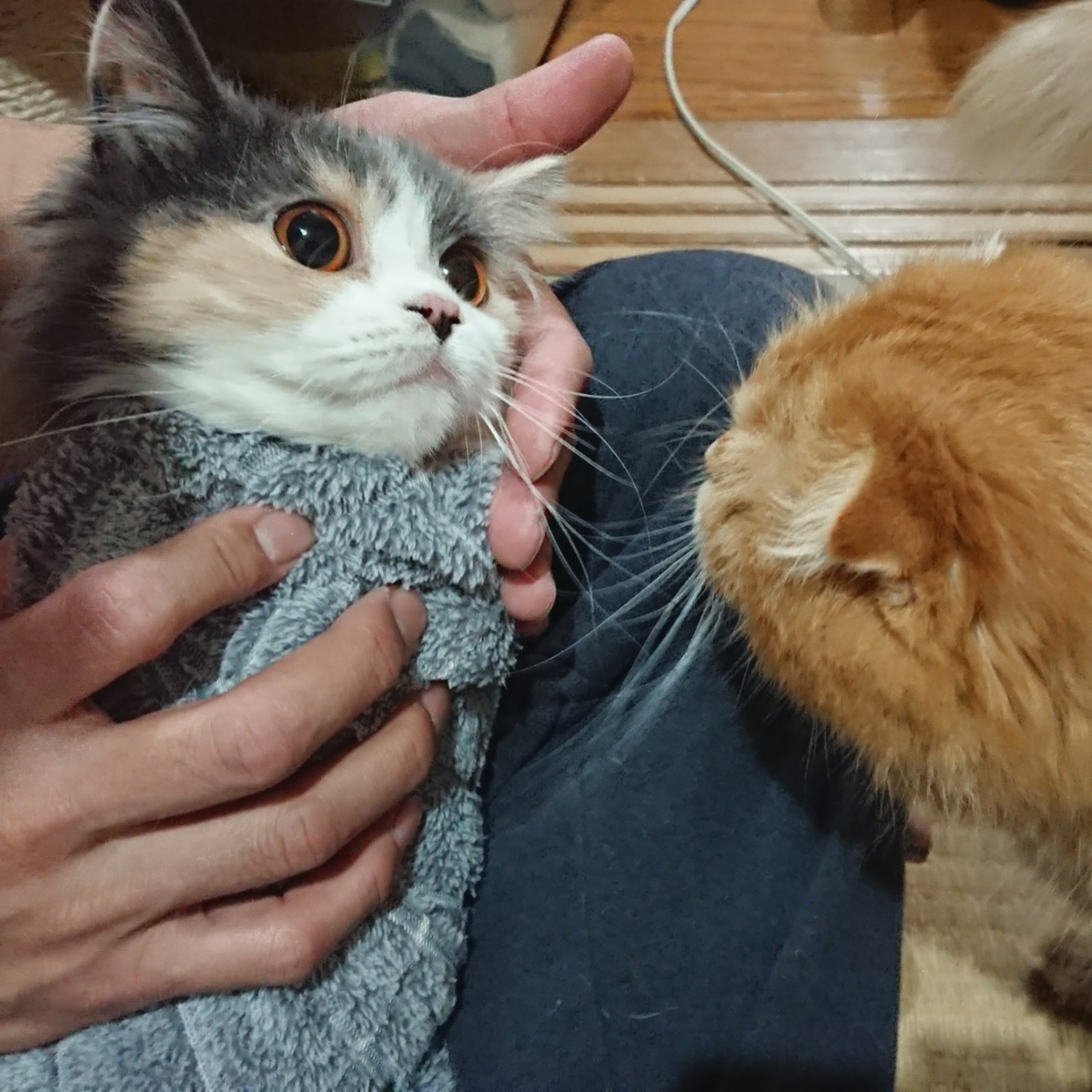 大暴れしましたが、ぐるぐる巻きにするとおとなしくなりました。