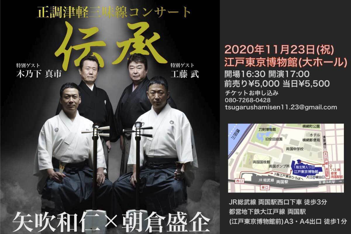 矢吹和仁・朝倉盛企による「正調津軽三味線コンサート」5周年記念公演を木乃下真市・工藤武というゲスト出演者を招いて、両国江戸東京博物館大ホールという素晴らしい会場で予定していましたが、新型コロナウィルスの影響により一時は開催を断念しなければならない状況にまで陥りました…。