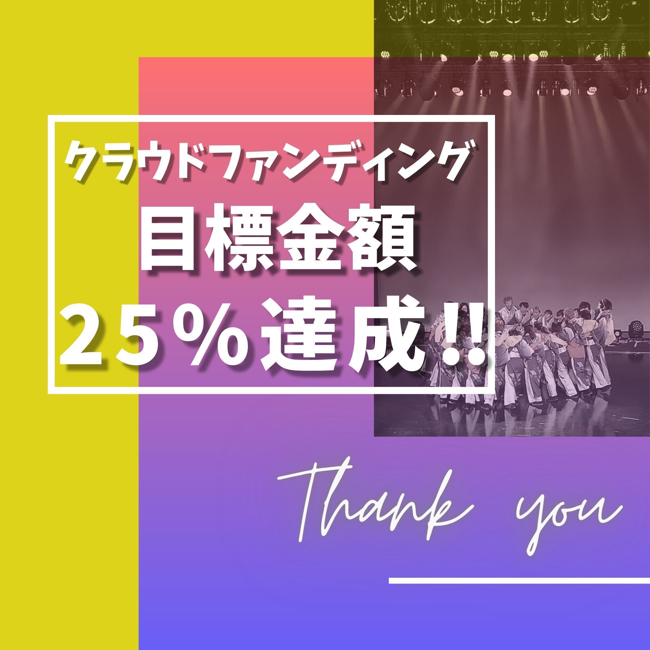先日10月11日に本クラウドファンディング目標金額の≪25%≫の支援が集まりました!支援者の方々に厚く御礼申し上げます。クラウドファンディング終了まで残り33日となりました。支援者の方々には本クラウドファンディングの拡散をしていただけると嬉しいです!目標達成できるよう努力を続けて参りますのでこれからも応援の程よろしくお願い致します!法政大学YOSAKOIソーランサークル鳳遙恋 クラウドファンディング担当