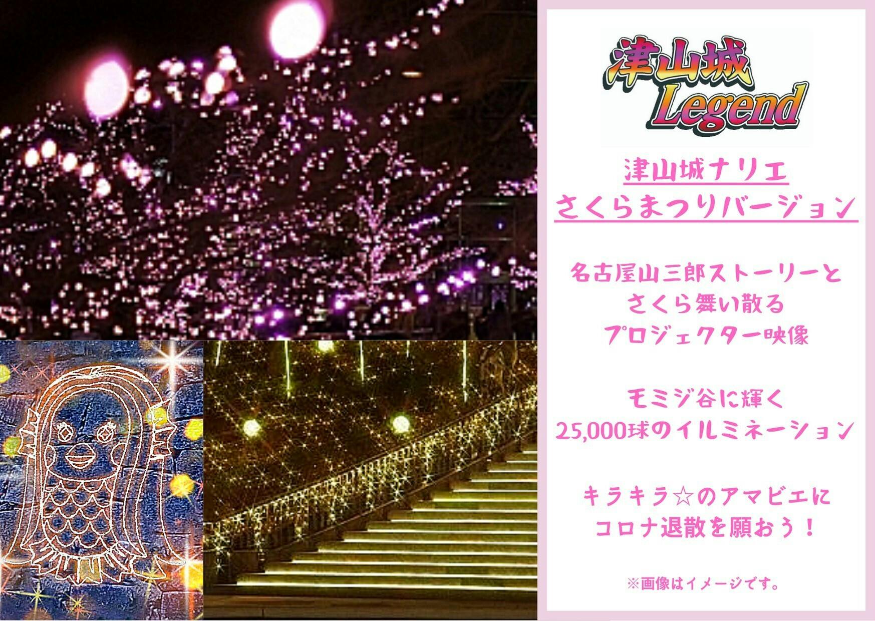 2021/03/16 02:13皆さま!!大変お待たせしました。「津山城ナリエ」を春のさくらまつりバージョンとして開催できることになりました(^o^)丿石段&石垣イルミ、アマビエイルミ、イルミツリー、プロジェクター映像で津山城(鶴山公園)を華やかに彩ります。リターンの看板とプロジェクター映像でのお名前投影、イベント実施時の画像送付にご支援いただいた皆さまには、お待たせして本当に申し訳ありませんでした。津山さくらまつり会場にて、リターンの履行をさせていただきます。そして・・・今後のコロナ状況にはよりますが、当初予定していた秋のもみじまつりでも同様に、再度、看板や投影の実施をしたいと考えております。まずは、津山さくらまつりでの「津山城ナリエ」をお楽しみください。実施場所:津山城(鶴山公園)もみじ谷日程:津山さくらまつり期間中 2021.3.27(土)~4.11(日) 日没~22:00 もっと見る