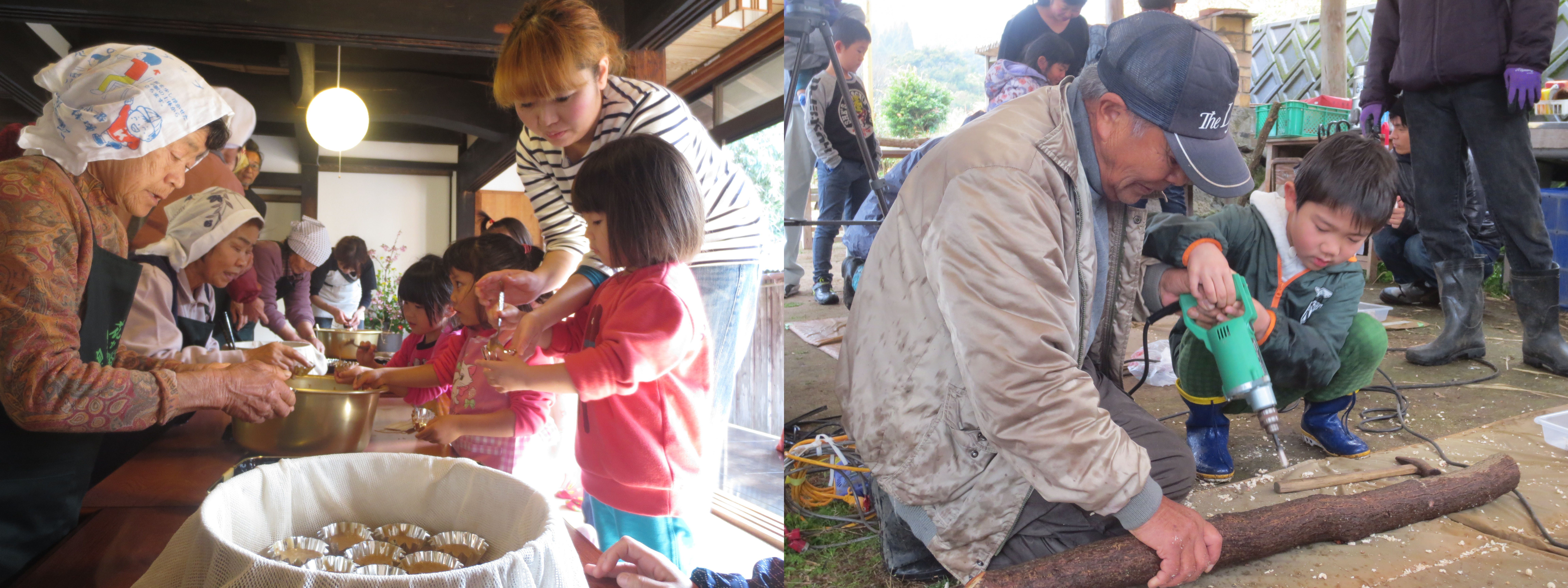 親子の体験活動では、ピザやパン作りなどの食の体験のほか、川遊びやかずらの山の探索、山菜採りなどの地域資源を活用した体験も行っています。また、集落のおじいちゃん、おばあちゃんたちにも協力を頂いています。体験活動の講師をお願いし、昔ながらの味噌作りやよもぎ団子作り、シイタケのコマ打ち等を親子に教えてもらいます。夏・冬の大きなお祭りでは、おばあちゃんたちはお揃いのエプロンを着け、そうめんを流したり、そば打ちの先生になったりと活躍します。この地域のおじいちゃん、おばあちゃんはとても元気です。