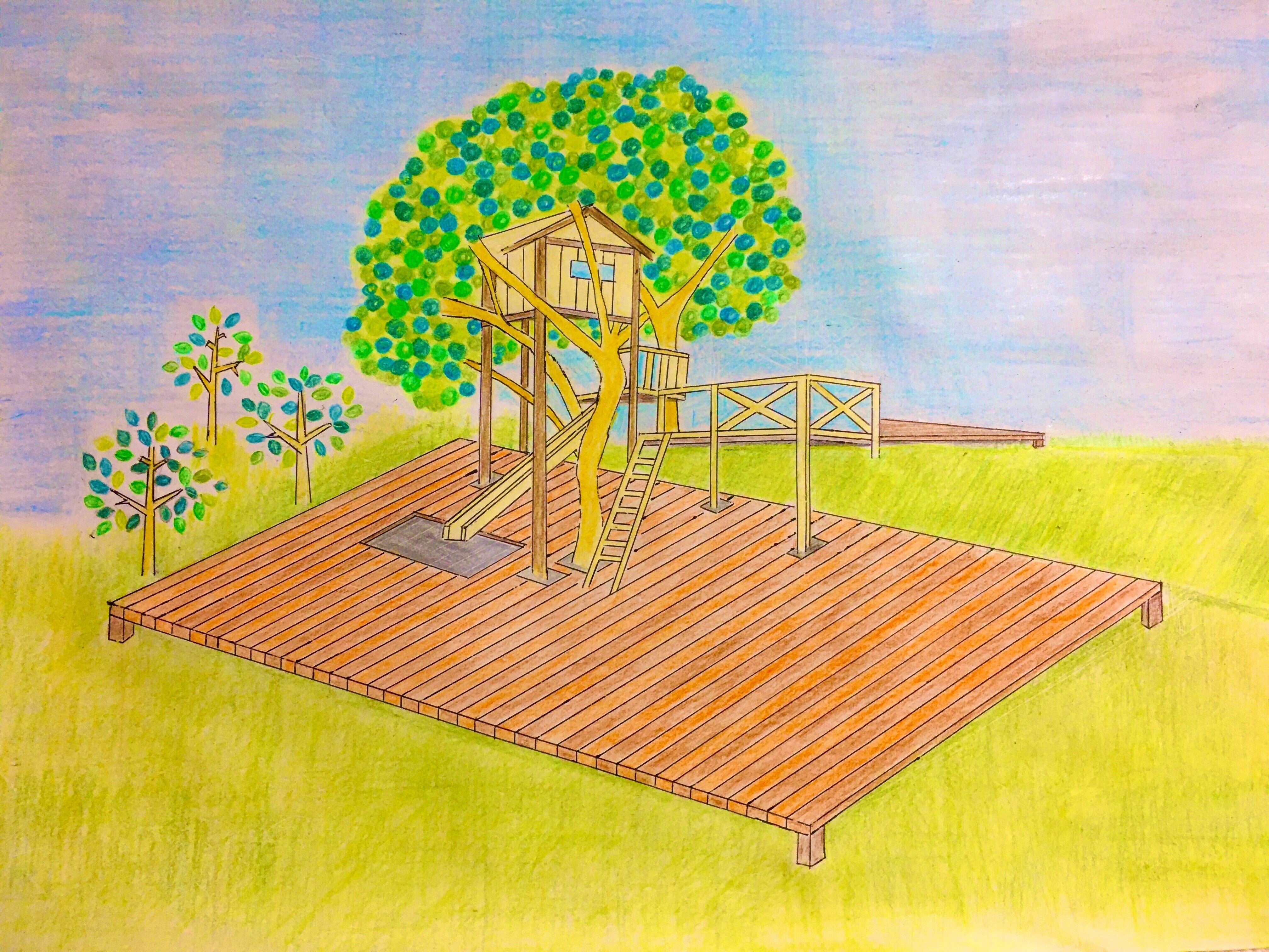 ツリーハウスは、エノキの葉が生い茂る夏には気持ちのいい木陰が出来、広場を訪れた人たちの癒しの場になっています。子どもたちは、ツリーハウスの中でよく「おうちごっこ」をして遊んでいます。そんな広場のシンボルであるツリーハウスの周りの環境をもっと整備し、子どもの遊び場を拡げたい!ウッドデッキを作り、子どもたちの遊びが想像力であふれる空間にしたい!との思いから今回のプロジェクトに取り組むことにしました。