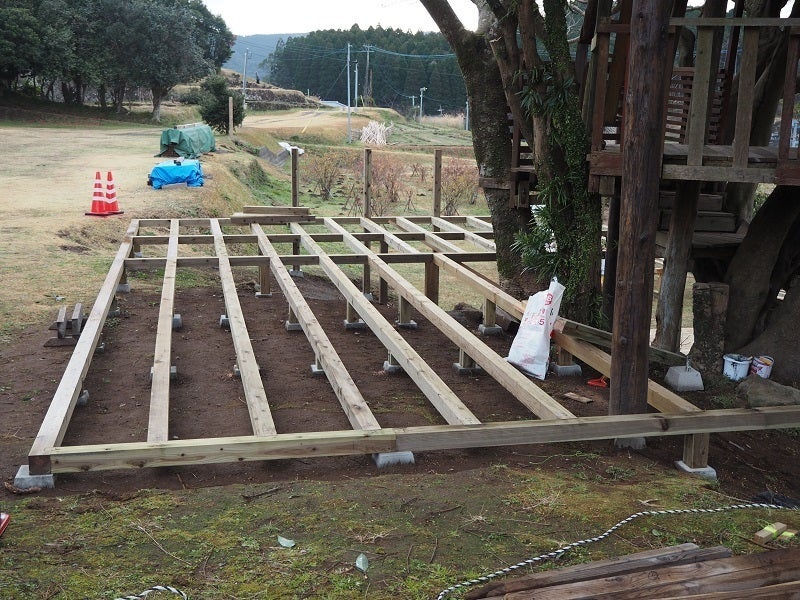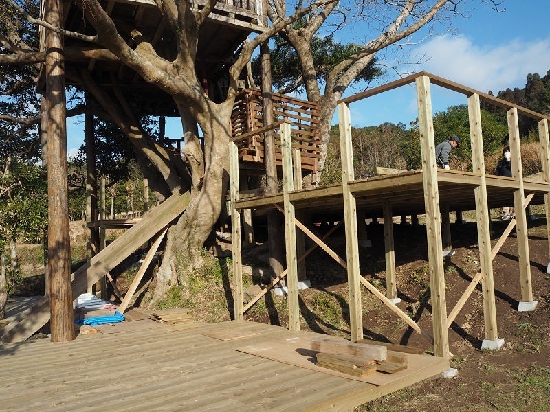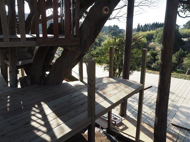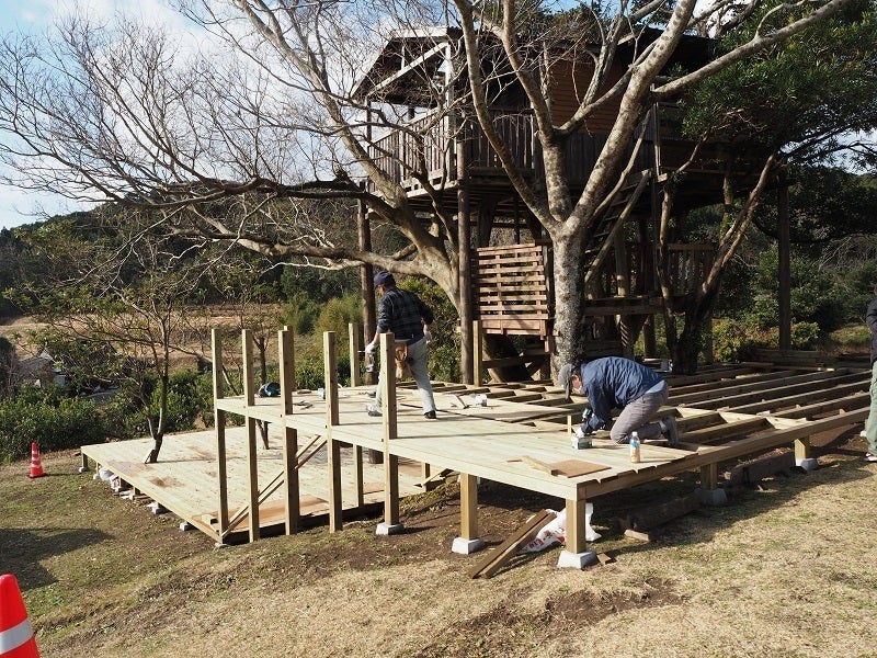 プロジェクトで取り組んだウッドデッキ作りは、1月中の完成を予定しています。現在、下段、上段のウッドデッキはほぼ完成し、あとは階段や手すりなどの部分の整備で完成です。お礼状とリターンの発送を始めました。お手元に届くまでもうしばらくお待ちください。