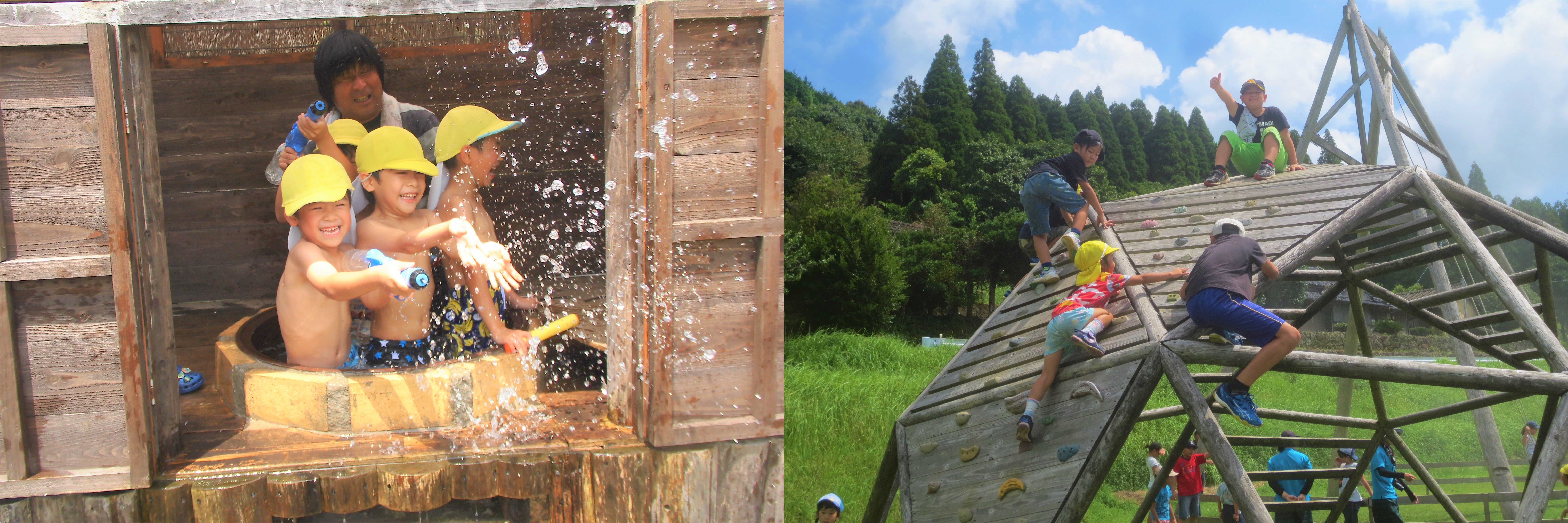 現在まで、木のぬくもりにこだわり、広場には木製の遊具を設置しています。ジャングルジムやハンモックブランコ、そして高さ10メートルのハイジブランコがあります。親子体験活動で広場に来た子どもたちは、お父さんやお母さんと一緒に木製遊具で遊んだり、広場を走り回りまっています。