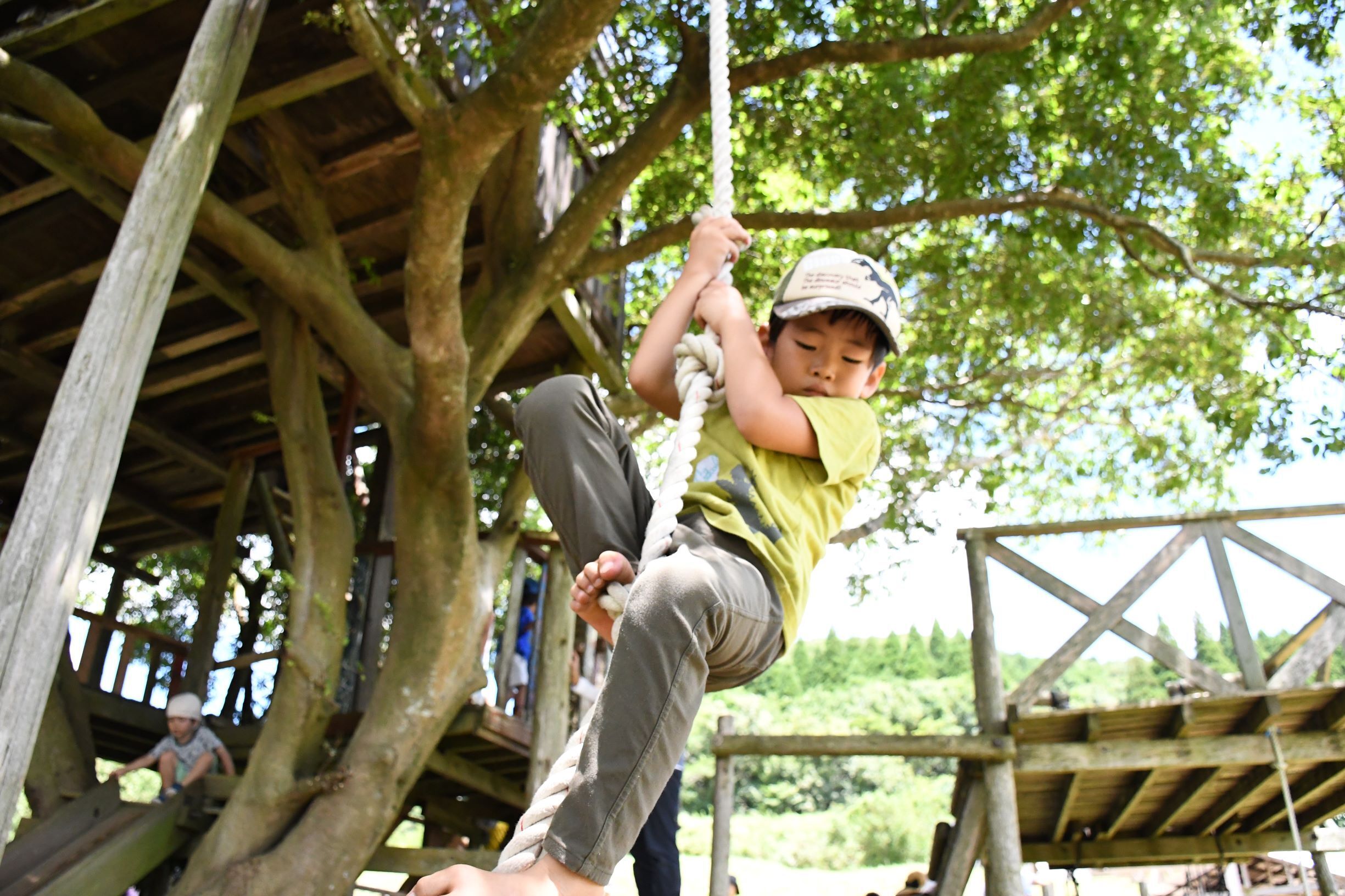 〈自然花〉が体験活動を行っている広場は通称「ツリーハウス広場」。名前の通り、広場には手作りのツリーハウスがあります。耕作放棄地の整備をしていた時、大きなエノキの木を見た集落の方から「このエノキを切るのはもったいない。広場のシンボルにしたらどう?」と提案があり、その後いろんな方の協力のもとツリーハウスは完成しました。