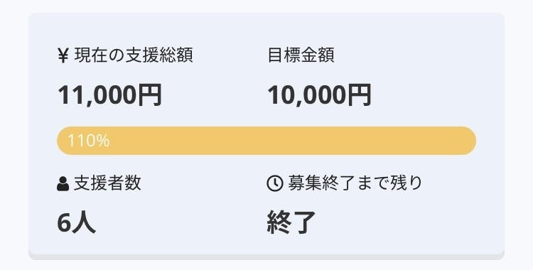 このプロジェクトは、2020/11/01に募集を開始し、 6人の支援により 11,000円の資金を集め、 2020/11/30に募集を終了しました