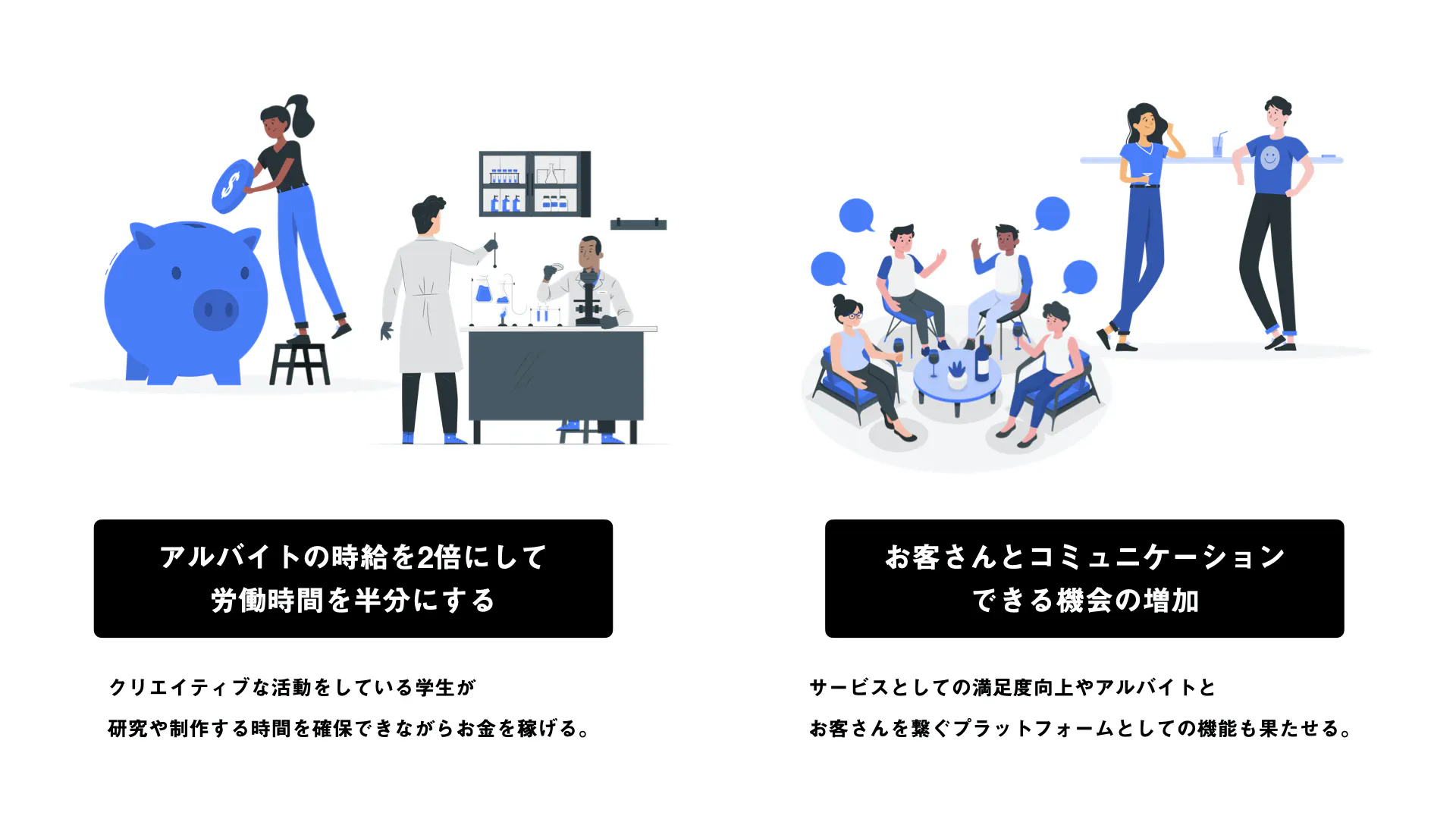 これらを実現させることによって従来掛かっていた人的、金銭的、時間的なコストを削減することで、アルバイトの給与の増加の他にもお客さんとのコミュニケーションをとる機会をとる機会が増えることでサービスとしての満足度向上やアルバイトとお客さんを繋ぐプラットフォームとしての機能も果たせると考えています!