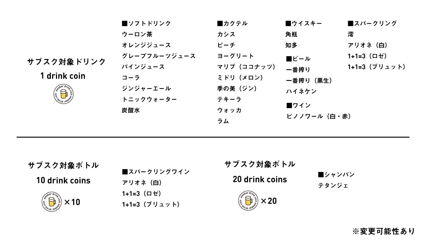 サブスク/drink coinの対象ドリンクとボトル