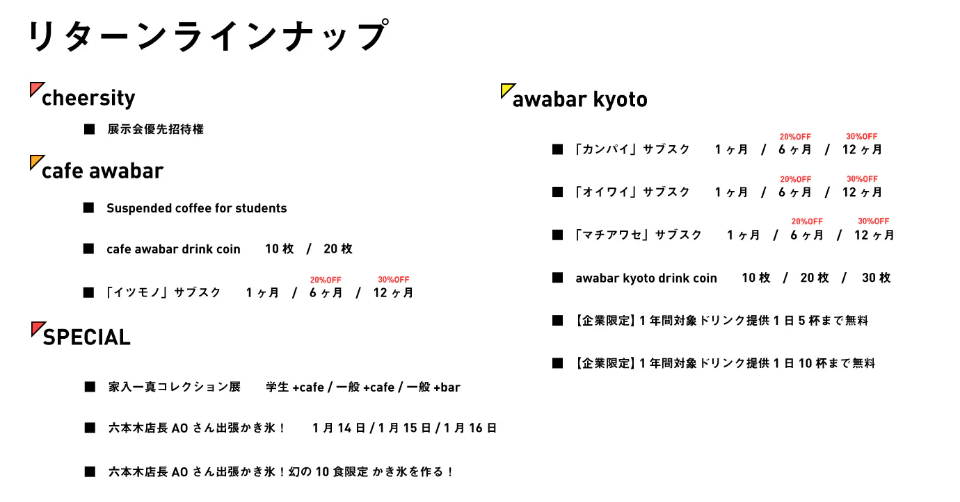 リターンはcheersityとしての取り組み、awabar kyoto 、cafe awabar の3つが存在し、京都に住まわれている方はもちろんのこと遠方の方でも喜んで頂けるようなものをメンバーで話を重ね決めました!緊急事態宣言等による非常事態によって営業日数が2/3以下になった場合も対応予定です。