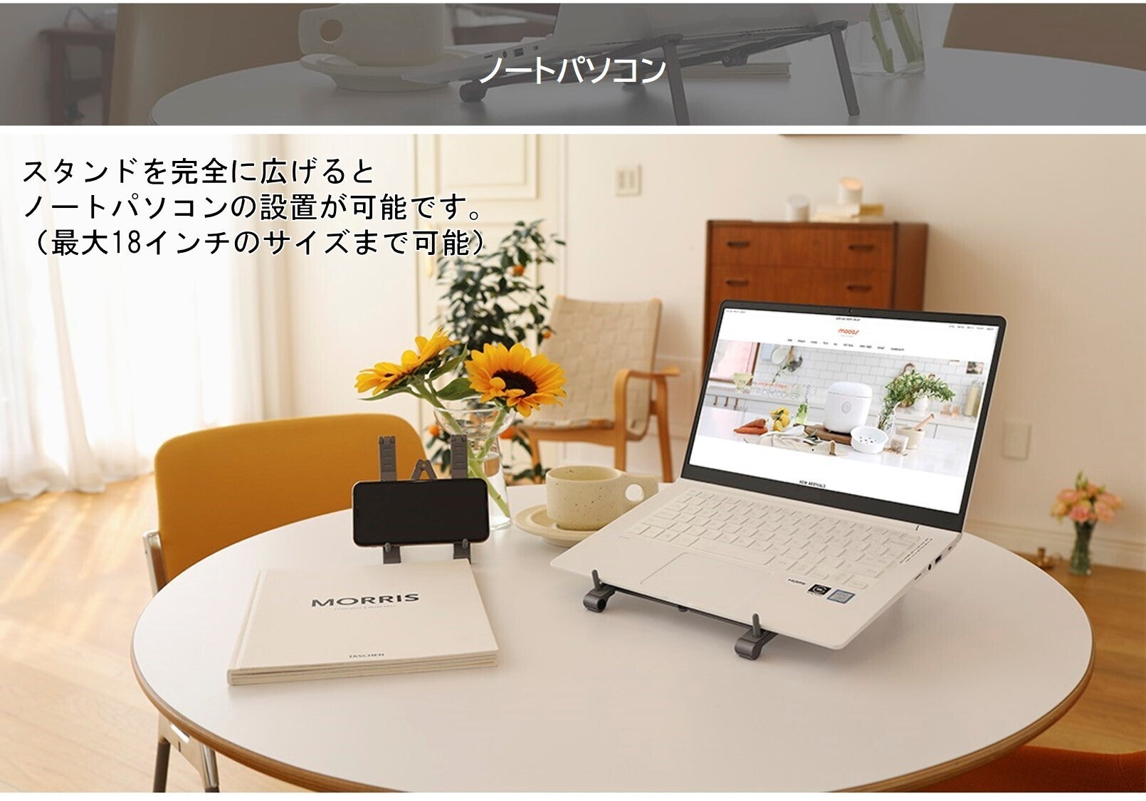 A :スマートフォン(縦置き、横置き)、タブレット、ノートPC、その他本や雑誌などにご使用いただけます。