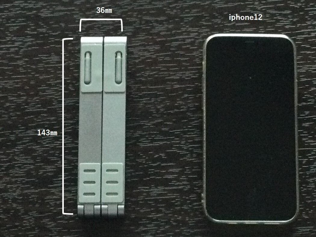 「超軽量ポータブルマルチPCスタンド」はとってもコンパクト!iPhone12と比べて、そのコンパクトさが実感できます。サイズ 143㎜×36㎜。どのスタンドと比べてもとても小さく持ち運びに便利です。どこでも持ち運べて、重さが大きさが気にならないアイテムです!