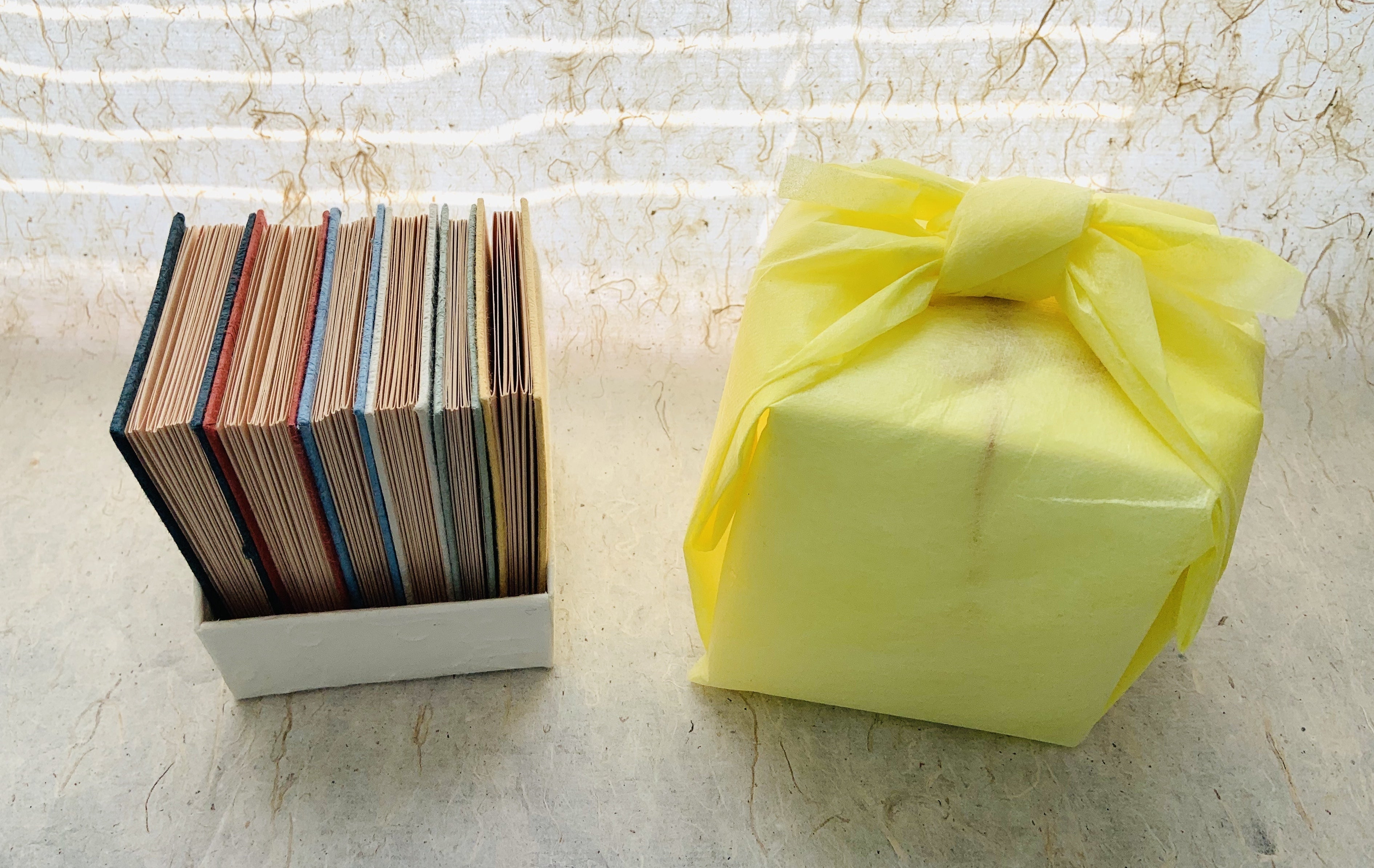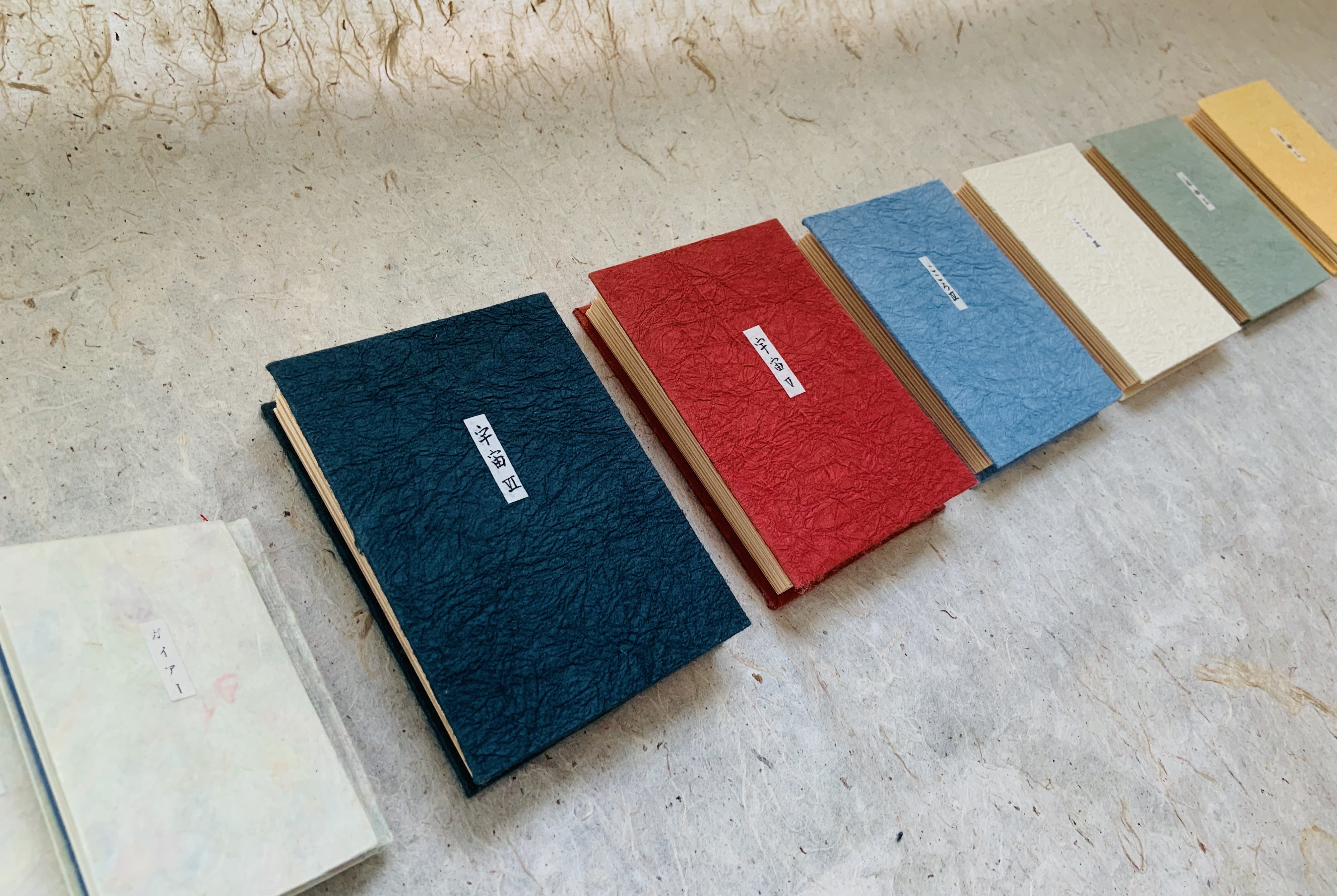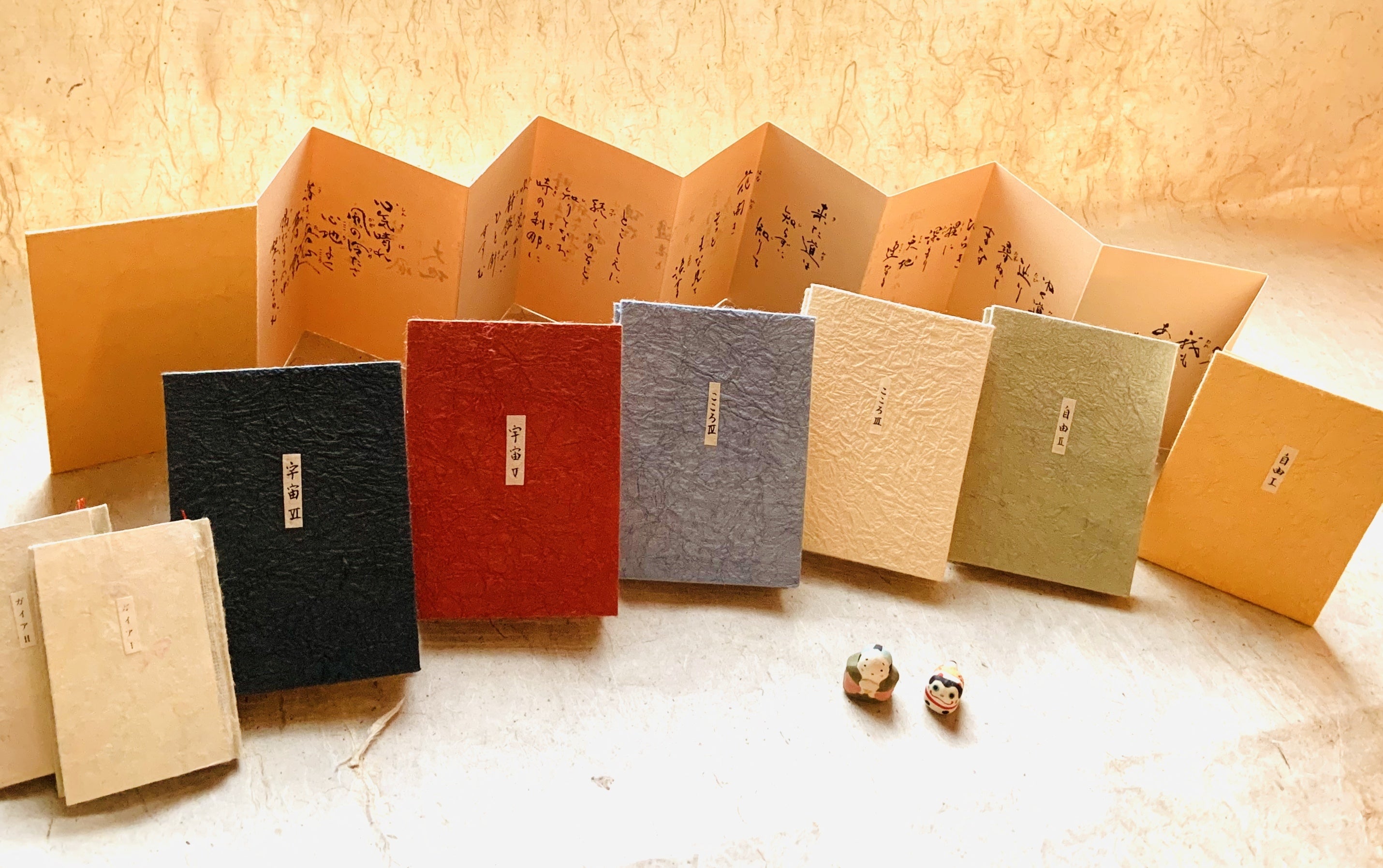 手製本した歌集は、和紙を使った昔ながらの本のように小さな折本・豆本に、1冊10〜20篇の詠をのせて、本として読んで頂いたり、屏風の様にお部屋のインテリアとしても飾って頂けます。