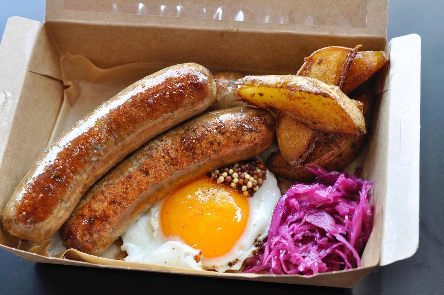 ソーセージ3種と目玉焼き、ポテト、ピクルスが乗った盛合せランチBOX。