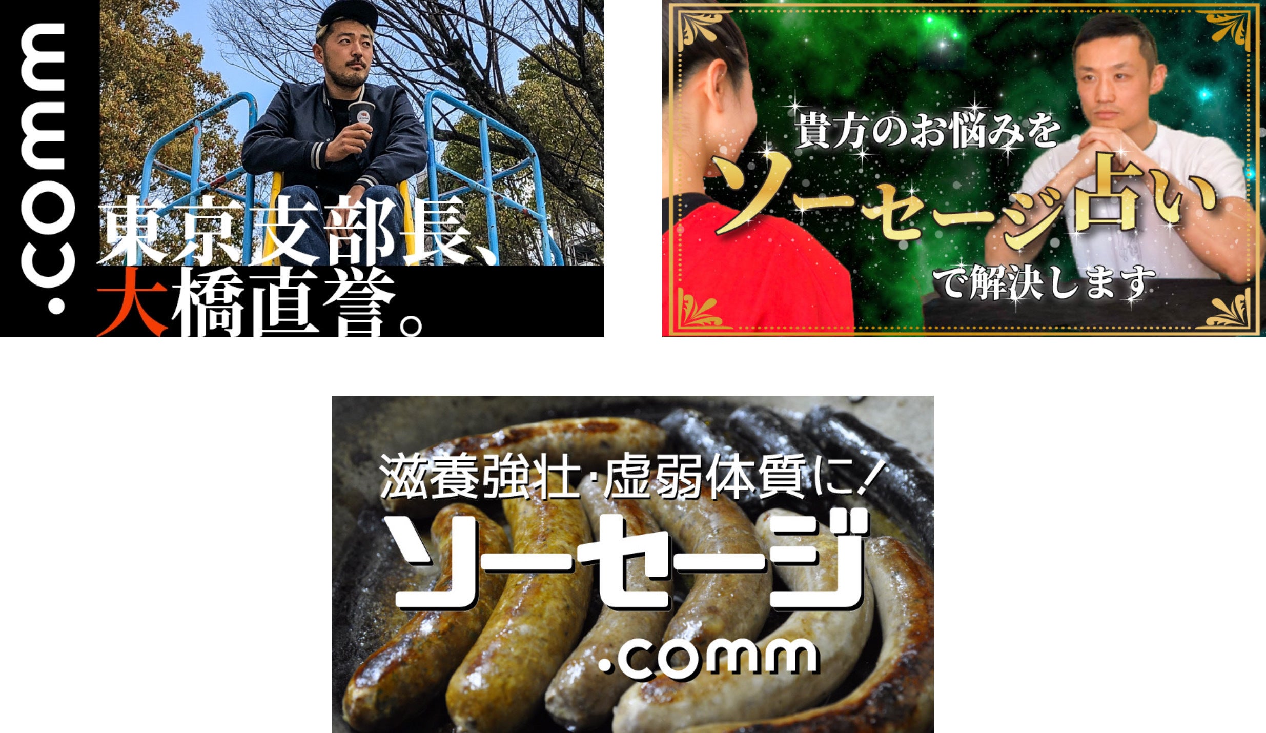 YouTubeチャンネルでは「ドットコミュ支部長インタビューシリーズ」「ソーセージ占い」「石垣島ファイト一発ソーセージ」などなど
