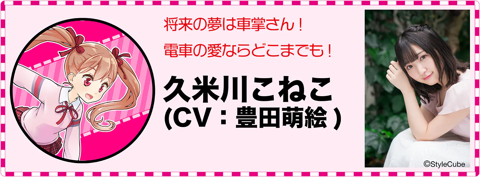 「将来の夢は車掌さん! 『こねこの車掌さん』で動画配信してる久米川こねこよ。今日はよろしくね」