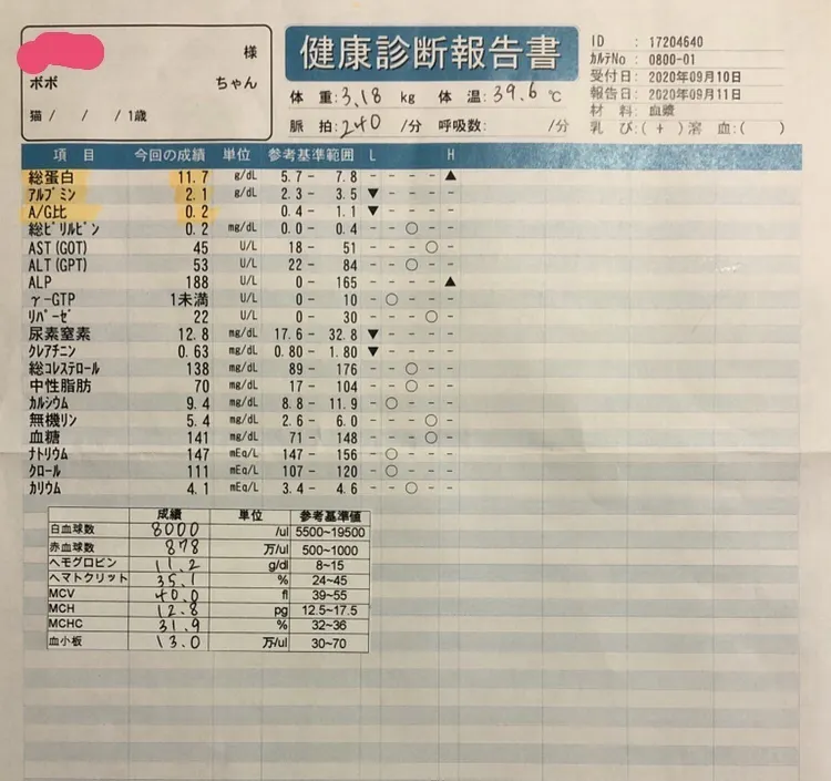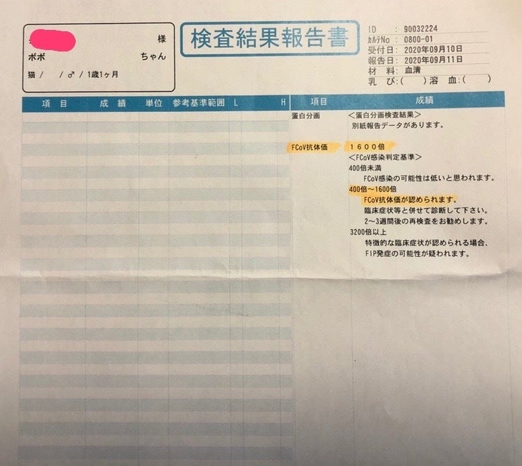 FIPの検査結果は抗体価が1600倍と言う数字が出ていて、FIPと伝えられました。