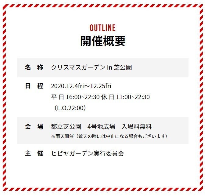 クリスマスガーデンとは、今年初の開催となるイベントであり、⽇本最⼤数となる約100本以上のクリスマスツリーを並べ、約世界10ヶ国、100種類以上のビールやお酒、クリスマスをテーマに約200種類以上のフード、クリスマスグッズの販売やクリスマスワークショップなど、⽼若男⼥問わず皆が楽しめる次世代型イベントとして、幻想的な冬の空間を演出、他には類を⾒ないクリスマスイベントを12月4日(金)から12月25日(金)までの22⽇間毎⽇開催致します。