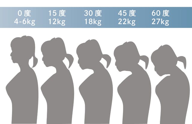 首肩にかかる負担は猫背になって頭が前方に傾けば傾くほどに強くなります。