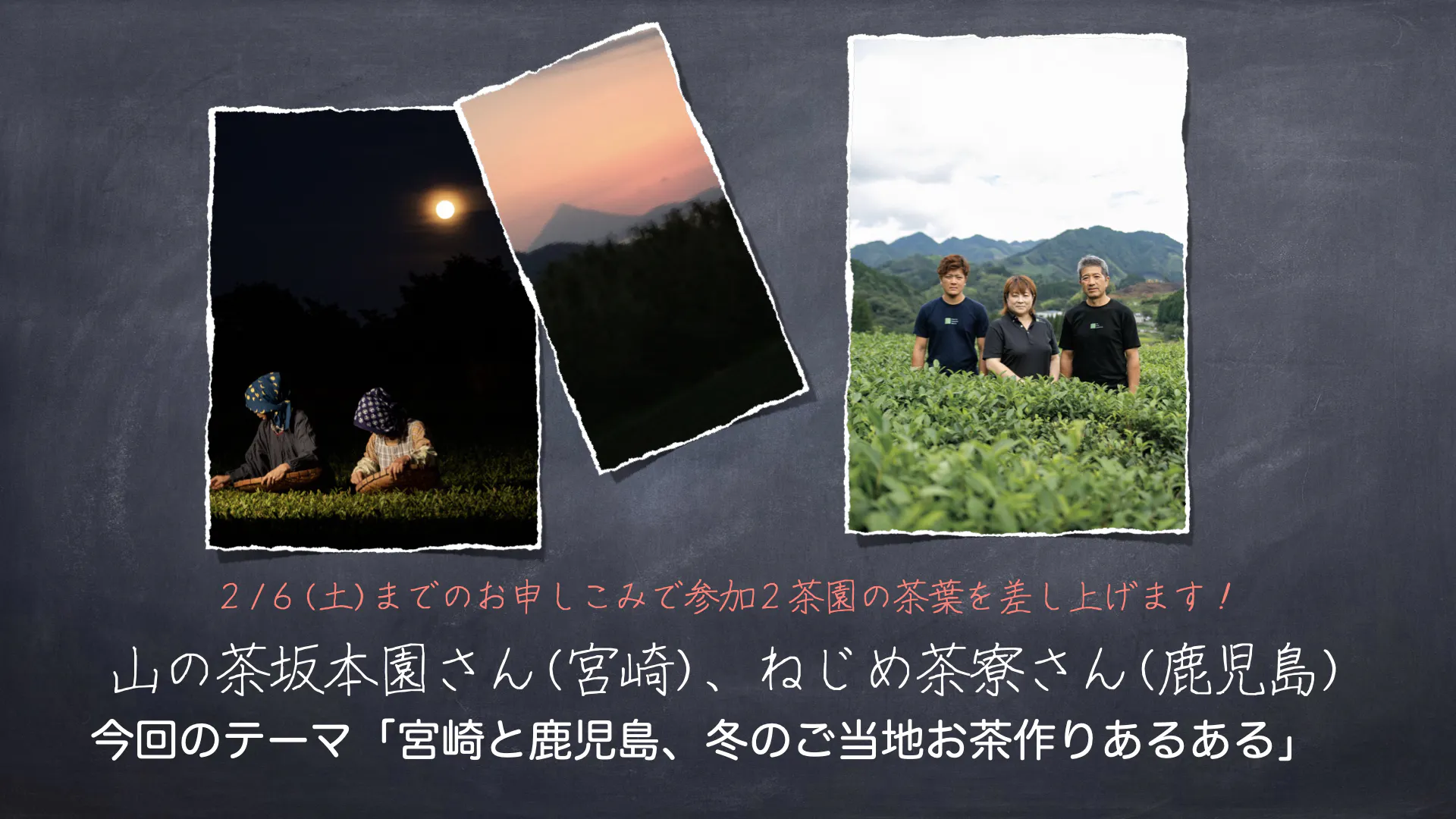 2月6日土曜日までのお申し込みで、今回のホスト3茶園の茶葉をお届けします!!(※普通郵便でのお届けです。天候などによって遅れが出る場合がございますので、できるだけお早めにお申し込みください。)