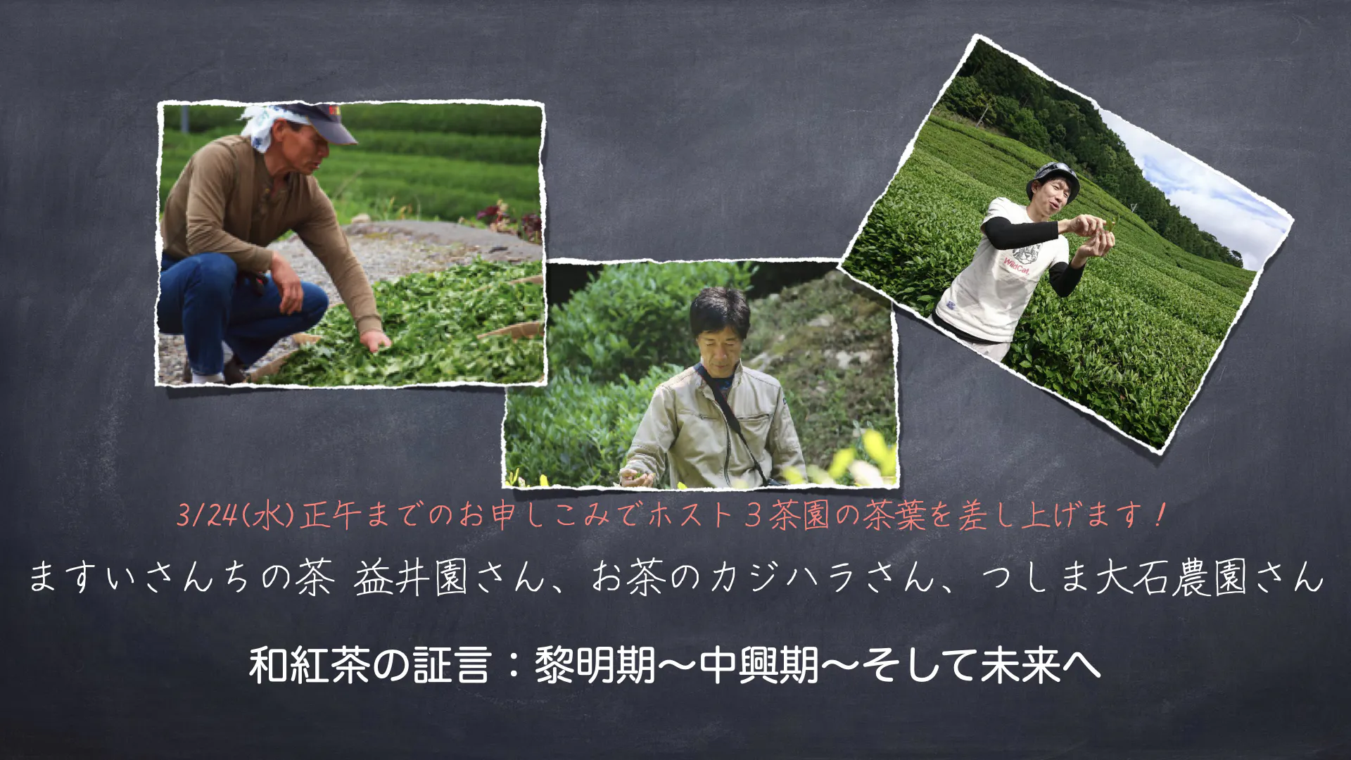 3月24日(水)正午までにお申し込みの方にはホスト3茶園(益井園、お茶のカジハラ、つしま大石農園)のお茶をプレゼントします!