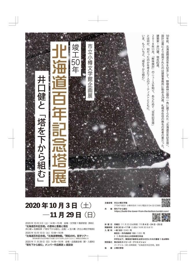 2020/10/15 21:29【お知らせ】クラウドファンディングへのリターン追加! 始まって1週間ほどのクラウドファンディングですが、さっそくたくさんの方にご支援いただいています。ありがとうございます。 この度、リターン(ご支援の返礼品)をたくさん追加しました! ご支援は2018年「塔を下から組む」の記録冊子(カタログ)カタログ制作費(印刷費、編集費、デザイン費、梱包費など)に充てられます。 ご協力よろしくお願いします。↓こちらからご覧ください!●CAMPFIRE 「塔を下から組む」カタログ出版プロジェクトhttps://camp-fire.jp/projects/view/331283…《展示情報》・市立小樽文学館企画展「竣工50年 北海道百年記念塔展 井口健と『塔を下から組む』」・2020年10月3日~11月29日9:30~17:00(入館は16:30まで)・毎週月曜(11月23日は開館)、11月4日、24、25日休館・入場料 一般300円、高校生・市内高齢者150円・座談会 11月29日(日)14時~16時・会場 市立小樽文学館(otarubungakusha.com/yakata)・詳細→ https://build-the-tower-from-the-bottom.tumblr.com/ (「塔を下から組む」ウェブサイト) もっと見る