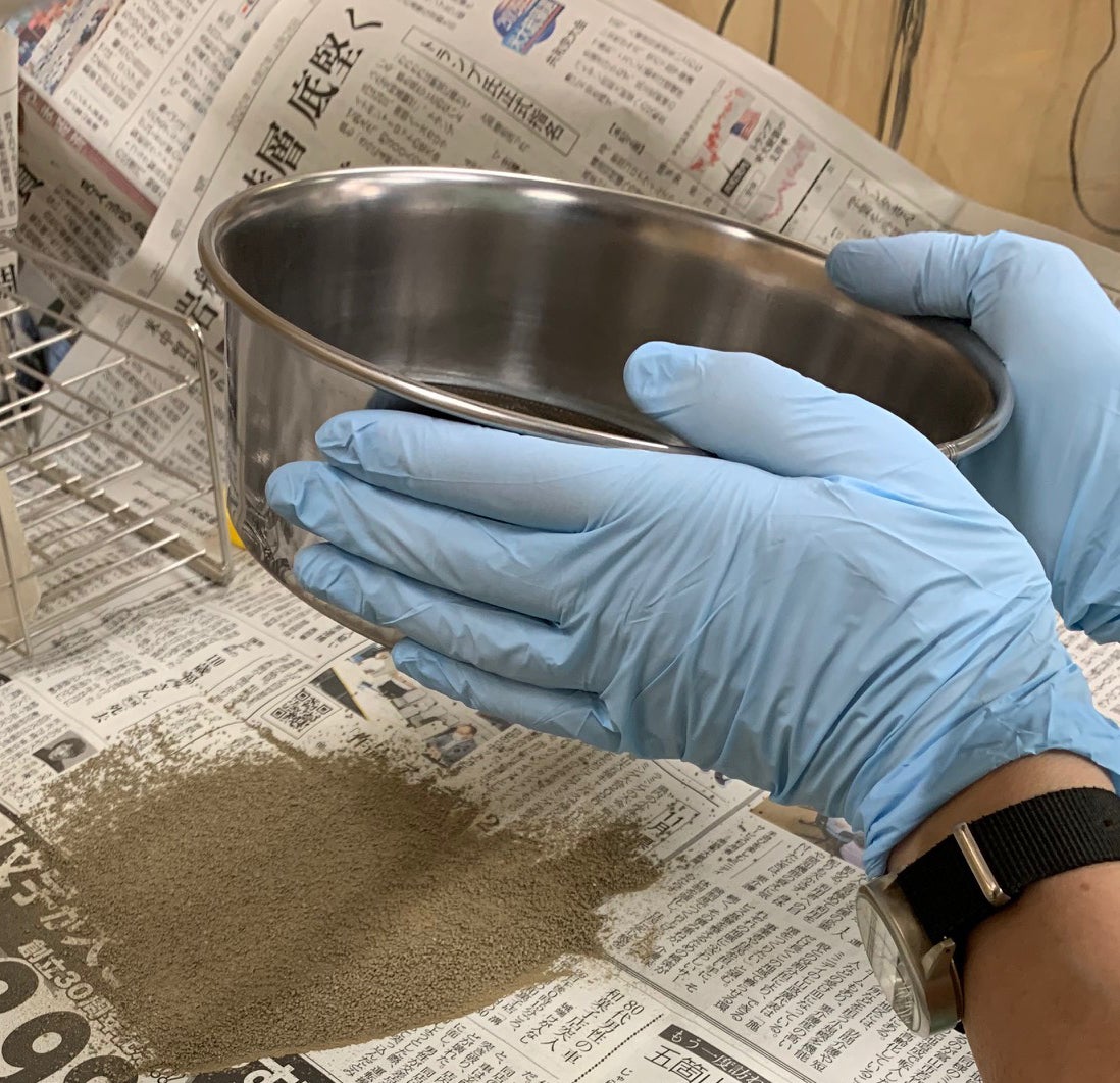 検査するため届いた土をふるいにかけます