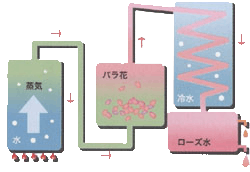 そうしてようやく咲いた、朝摘みの薔薇(香りを1番包んだ状態)を水蒸気で蒸留し、ローズ水とローズオイルに分けます。