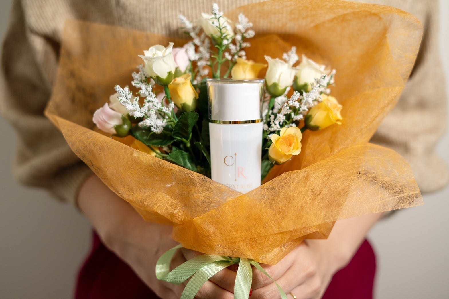 2、ゆっくり目を閉じ、ローズの香りを感じながら、角質層まで成分を行き届かせます。