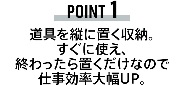単に道具を置いているだけなので、必要な時にすぐに取り出せ、使い終えれば“置いて”収納でき、作業効率が大幅にアップ。