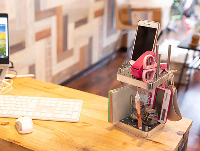 【OMO-TAI】を縦方向に2台連結すれば、スマホ、ハサミやホチキス、メモやペン、電卓など立体的に美しく置ける上、道具類の出し入れも簡単に。