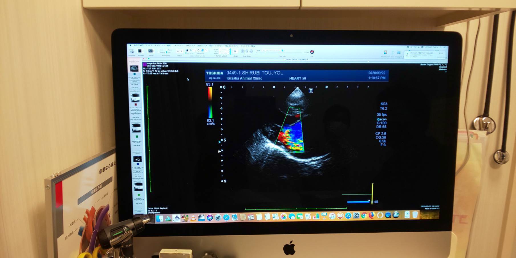 心臓のエコー写真僧帽弁がしっかり閉まらずに左心房へ血液が逆流してるのがカラーになって写ってます。