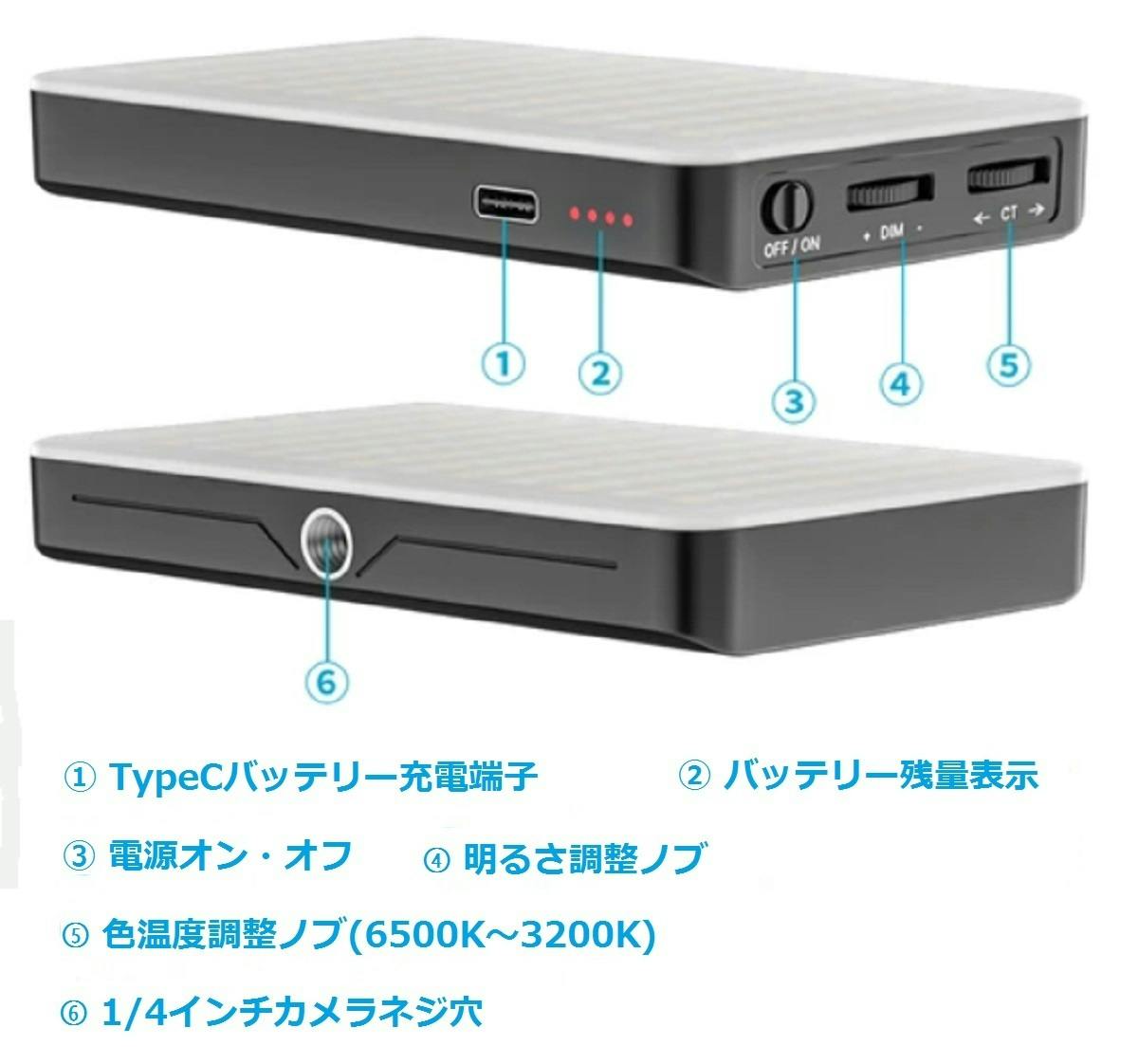バッテリーを内蔵しており、付属のTypeCケーブルを使ってスマートフォン用AC充電器で充電できます。色温度も6500K(冷たい感じ)~3200K(暖かい感じ)の範囲で調整できます。以下は商品の各ボタン・スイッチです。