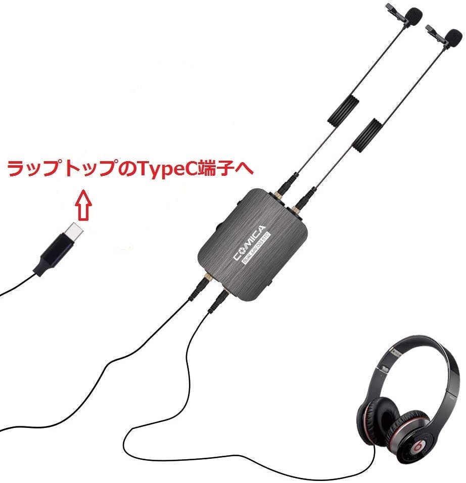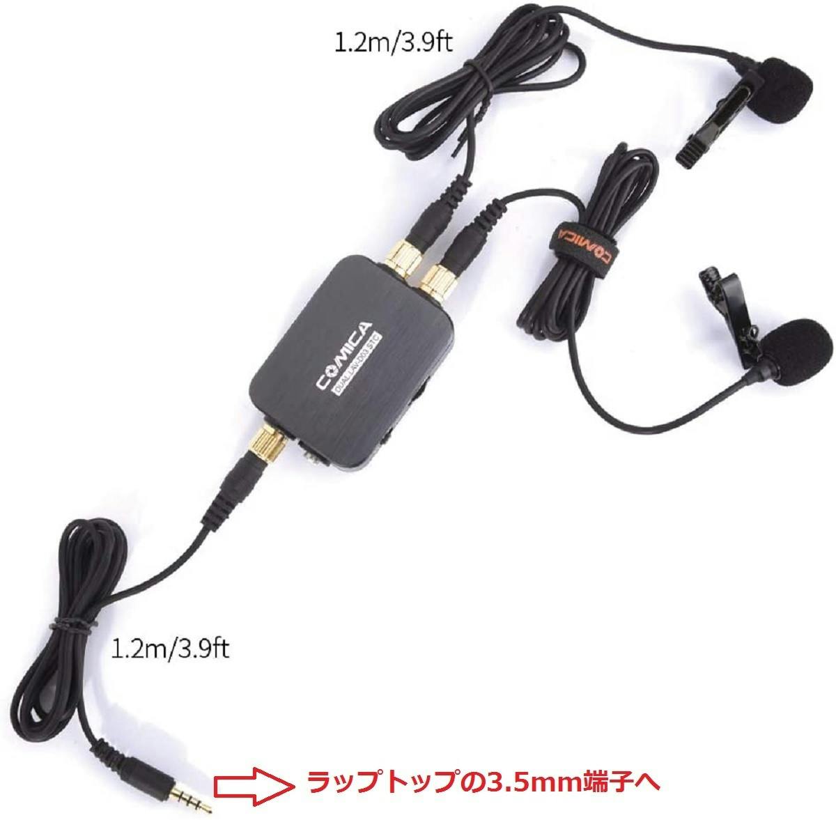 続いてピンマイクシステムについて、ご説明します。非常に安価でピンマイクにケーブルがつながっているだけというタイプもありますが、今回のタイプはその様なものではなく本格的なタイプです。ピンマイクとコントロールユニットがあり、接続するラップトップも、Type-C端子を持っているタイプ、Type-C端子を持っていない汎用3.5mm端子タイプの両方に対応します。2種類の出力接続ケーブルが同梱されています。