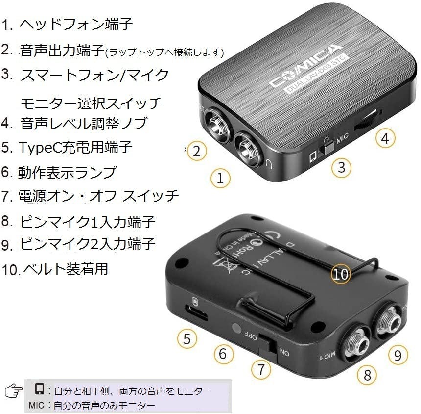 コントロールユニットは400mAh容量の充電式バッテリーを内蔵しています。付属のType-C--USB-Aケーブルを使って充電します。またピンマイクは二つ接続可能で、例えばプライベートタイムで夫婦、兄弟で、遠方の家族と話す事などができます。↓ イメージ写真