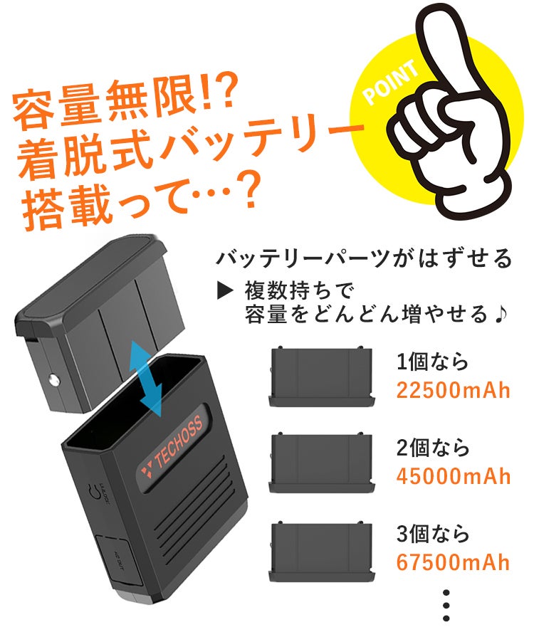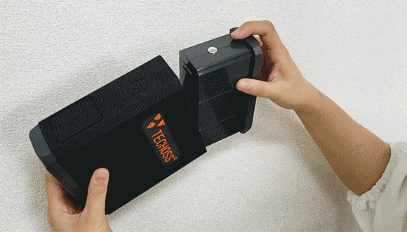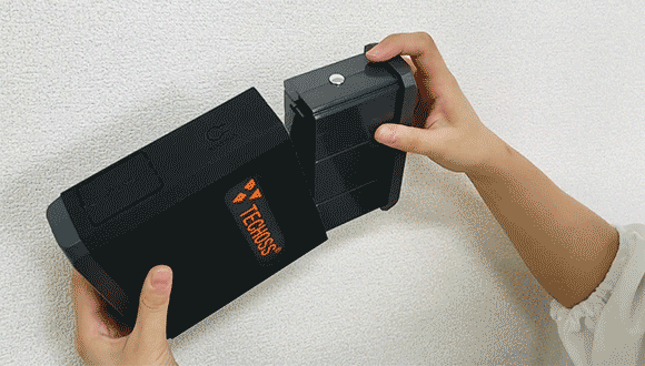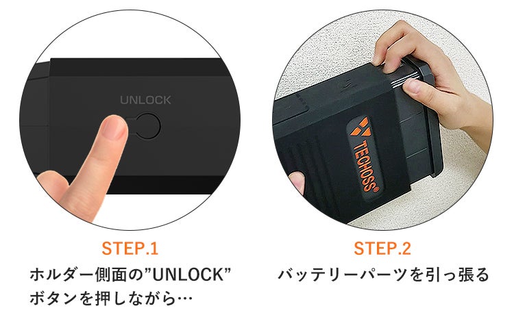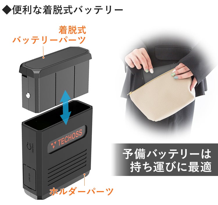 バッテリーパーツとホルダーパーツ、2つのパーツからなる「TECHOSS」は、バッテリーパーツの取り外しが可能!