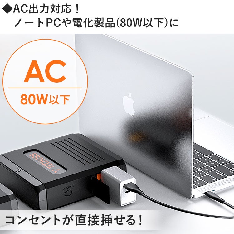 「TECHOSS」最大のポイントは、AC出力に対応している点。コンセントが直接指せるので、ノートPCをはじめ、80W以下の様々な電化製品への給電・充電に対応。一般的なモバイルバッテリーと比べると活躍の場が大きく広がります。