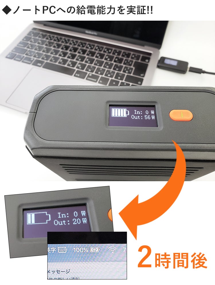 検証結果:約2時間でフル充電が完了。「TECHOSS」の充電残量は、100%→約40%に減少。供給能力は50W~60W。(ただし、ノートPC充電量が上がるにつれて減少。)