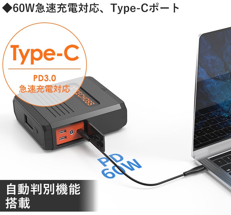 Type-Cポートは、60W急速充電に対応。急速充電の規格である、PD3.0と互換性が有り、接続すると自動的に急速充電が開始されます。