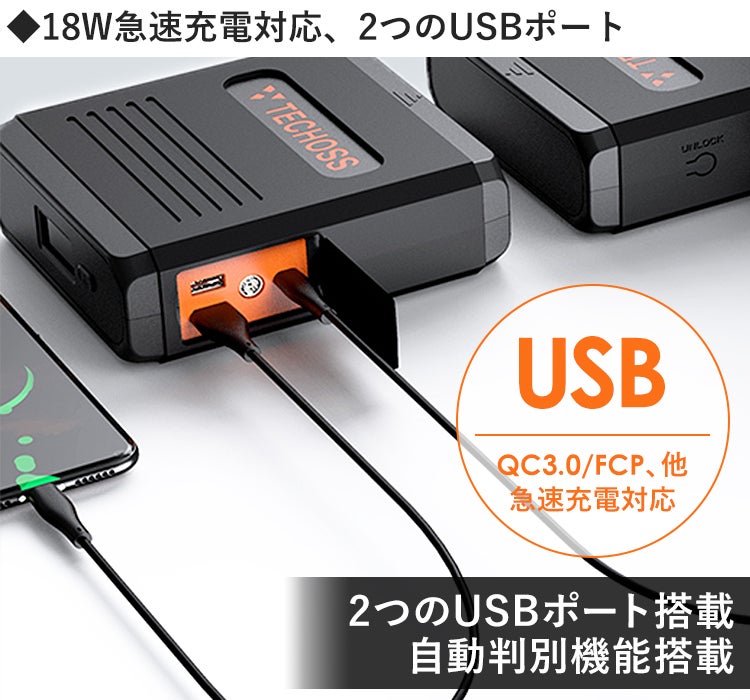 2つのUSBポートも搭載。こちらは、18W急速充電に対応しています。急速充電の規格である、QC3.0、FCP(HUAWEI規格)、AFC(SAMSUNG規格)と互換性が有り、接続すると自動的に急速充電が開始されます。