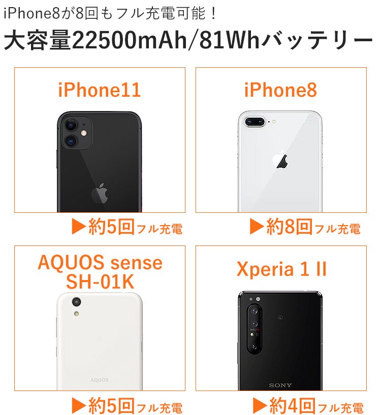 22500mAh容量で、なんと、iPhone8なら約8回もフル充電可能!