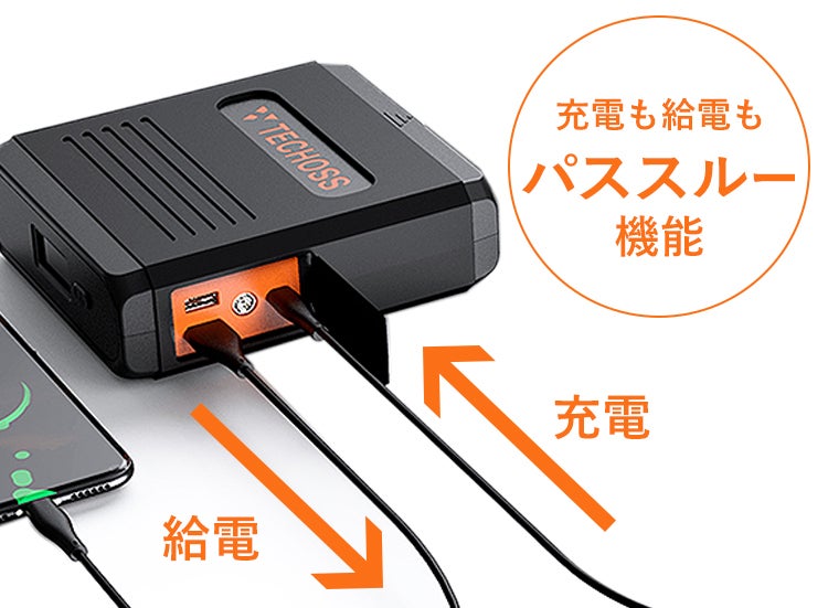 本体の充電と、デバイスへの給電を両方行ってくれる、パススルー機能搭載。 電源と繋いでおくことで、数時間後には、本体の充電も、デバイスの充電も完了しているという便利な機能です。