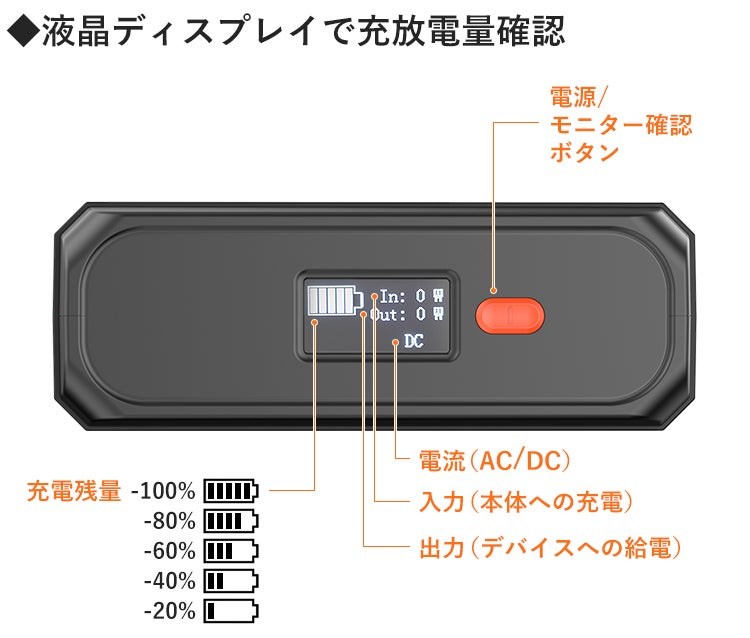 A:液晶ディスプレイで、バッテリー残量、充放電状況などご確認頂けます。ディスプレイ は、確認ボタンを押すことで表示されます。
