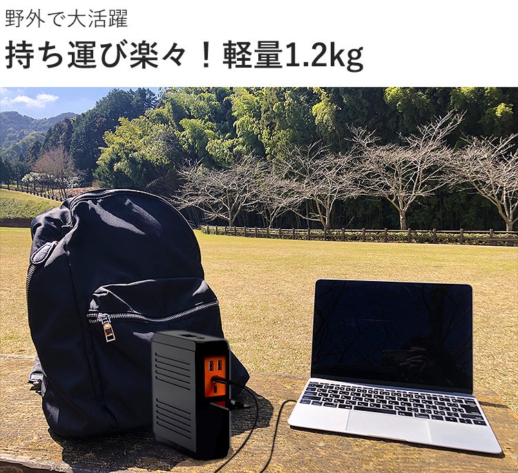 本体の重さは約1.2kg。ポータブル電源としては非常に軽く、コンパクトなので、例えばリュックやバッグに入れて、どこへでも気軽に持ち運んで頂けます。