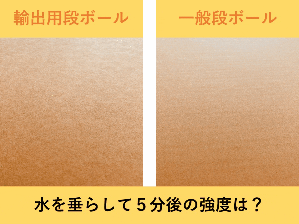 我々が使用している輸出用の段ボールは、木材の代わりに使用されており強度も高く、耐水性の高い紙を使用することによって多少の水濡れも平気です。