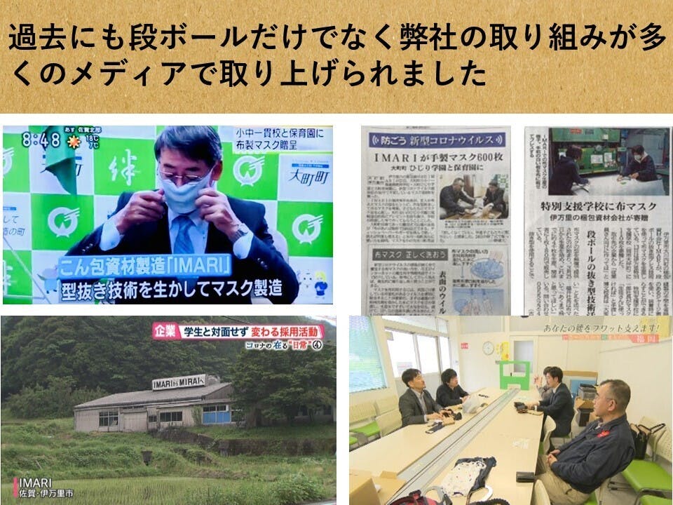 段ボール箱製造に限らず、他企業とのコラボレーションやWEBによる採用活動など新しい取り組みにも積極的に取り組んできました。今年の春先、全国的にマスク不足が深刻になった際には段ボール加工の技術を生かして布製マスクを製造。それらを地域の学校への寄付するなど社会活動にも取り組んでいる会社です。