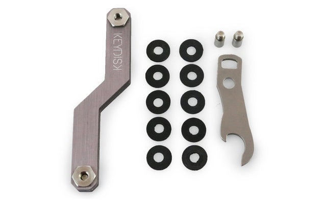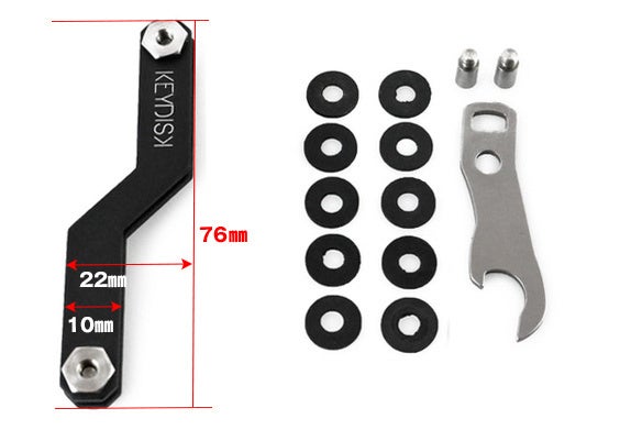 すべてのKEYDISK MINIには、10個のゴム製スペーサー、栓抜き/キーループ、およびエクステンダーのセットが標準で付属しています。