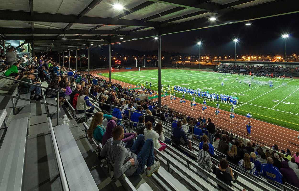 陸上トラックがあるとフィールドが遠いという印象もありますが解決する事例が米国のハイスクールのアメリカンフットボールのスタジアムにあります。